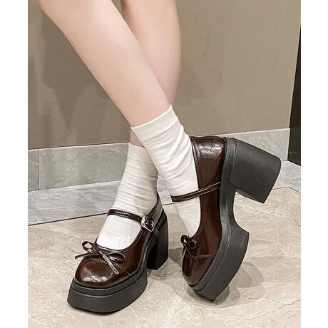 リボンが可愛らしい、上品な光沢感のPUレザー素材を使用した厚底メアリージェーンローファー。