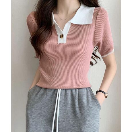 配色デザインが目を引く襟付きリブニットトップス。