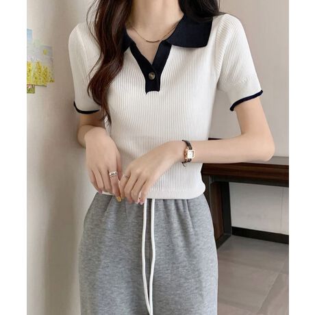 配色デザインが目を引く襟付きリブニットトップス。