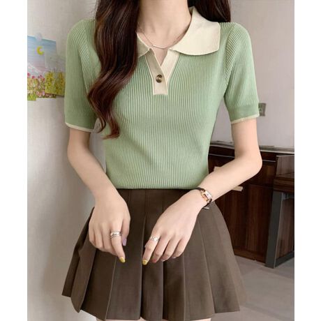 ポロニットトップス半袖ポロシャツVネック