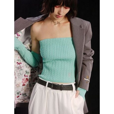 アームウォーマーがセットになったニットベアトップ。左下にはオリジナルロゴ刺繍をあしらい、さりげないアクセントを添えています。シャツやTシャツに重ね、アームウォーマーを合わせることで一気にトレンド感のあるスタイリングに。ニットカーディガンと合わせてアンサンブルとして着こなすのもおすすめです。<b>【Fabric】</b>