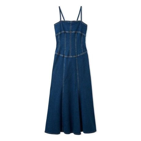 春夏シーズンのムードを高めてくれるデニムキャミワンピース。上身頃は切り替えを入れたコルセットデザインで身体に沿うようにフィットし、ウエストラインを少し下げてカーブをつけることで、今っぽいバランスに仕上げました。バックレースアップでウエストの微調整が可能なのも嬉しいポイント。スカート部分はタイトすぎないマーメイドラインで、女性らしいシルエットを演出します。春先は薄手のニットやシャツをインナーにレイヤードするスタイリングがおすすめです。