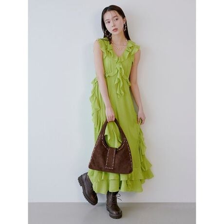 さらりとしたシフォンにネップの立体感が奥行きを生み出す楊柳が織り込まれた程よい透け感のシフォン楊柳を使用。贅沢にフリルをあしらい軽やかながらも華やかなワンピースに仕上げました。