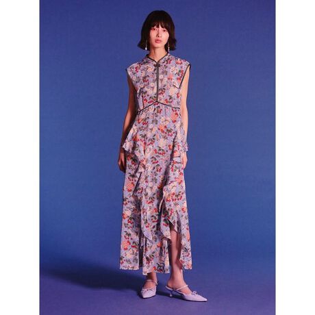 <b>【アーカイブ柄を纏う、配色チャイナが映えるフリルワンピース】</b>