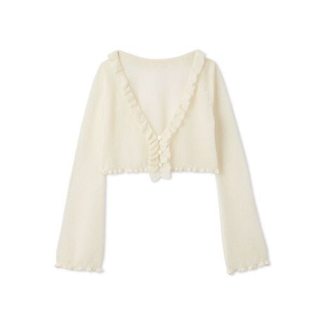 「LILY BROWN」で人気のフリルカーディガンが、今シーズンはより軽やかな透かし編みでアップデート。程よい透け感のあるレース編地が春夏のスタイリングにフィットし、脇役でありながら華やかさも備えた優秀アイテムです。コンパクトなシルエットで、ワンピースやボリュームボトムとも好相性。深めのVネックは抜け感を演出しやすく、肩を少し落として肌を覗かせたり、ゆるっと羽織ってルーズに着るなど、幅広いアレンジが楽しめます。