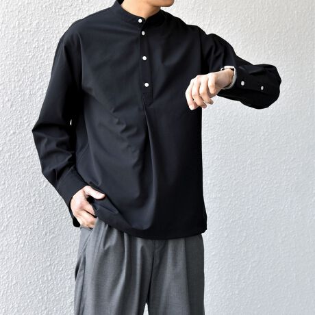 今期は人気のタック入りバンドカラープルオーバーシャツの裾をスピンドル仕様へとブラッシュアップ!