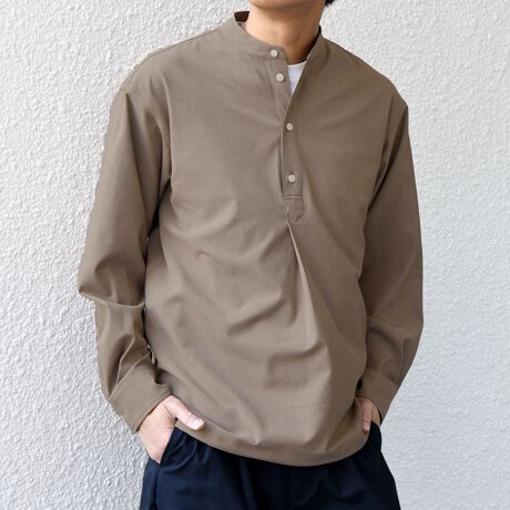 今期は人気のタック入りバンドカラープルオーバーシャツの裾をスピンドル仕様へとブラッシュアップ!