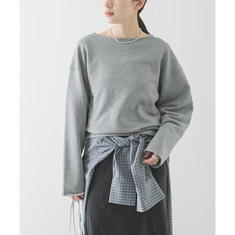 衿ぐりと袖口に施したカットオフ仕様が、ラフなアクセントをプラス。カジュアルなスウェットながら、広めのボートネックデザインが顔まわりをすっきりときれいに見せてくれます。