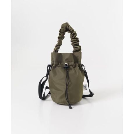 ハンドル部分のギャザー仕様が印象的なショルダーポーチ。内側には小物類の分類収納に最適なオープンポケット、ショルダーストラップは取り外し可能なのでシンプルなミニトートバッグの様な見た目も楽しめます。また天面部分の紐を絞って巾着バッグ的な使い方も可能です。