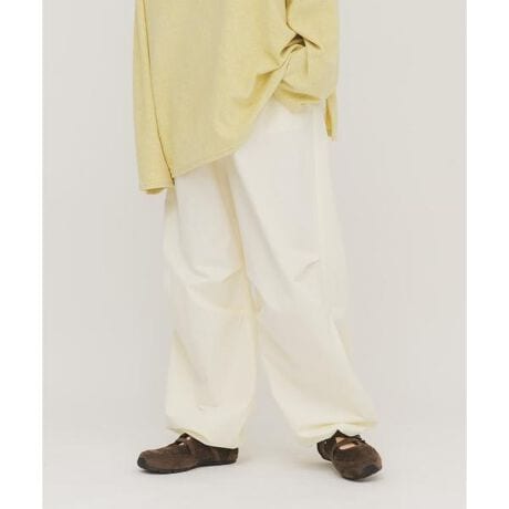 少しハリのあるドライタッチな素材を使用したカーゴパンツ。膝付近に大きなタックを施すことでボリューム感を持たせました。オールシーズンの着用が可能になっており、コンパクトなトップスと好相性です。