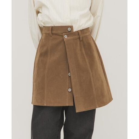程よくハリがあり、レンド感のあるスエード素材を使用したミニスカート。1枚着のみならず、前開きデザインになっており、釦を開けパンツの上からレイヤードした着こなしも叶います。