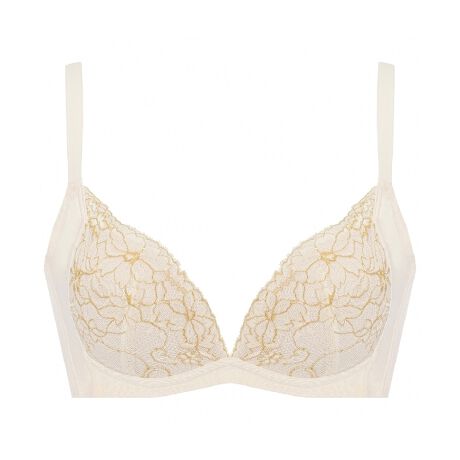 カップのサイド部分をカットした特殊なカップ形状と伸びないシートのパネルを組み合わせた構造で、バストサイドの横広がりを抑え、すっきりとシャープなシルエットに。