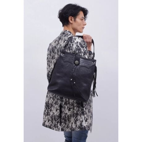 ウエスタンテイストを核に据えながら、オーバーレイ、フリンジ、コンチョといった装飾を大胆に配置したレザートートバッグ。
