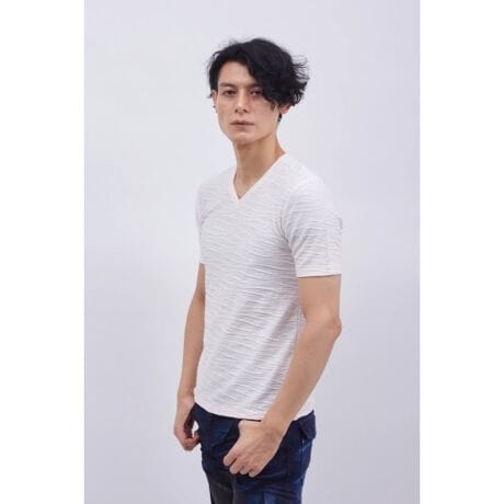 日本の技術が息づく、ボーダータックジャカードの涼やかでスタイリッシュなVネック半袖カットソー。