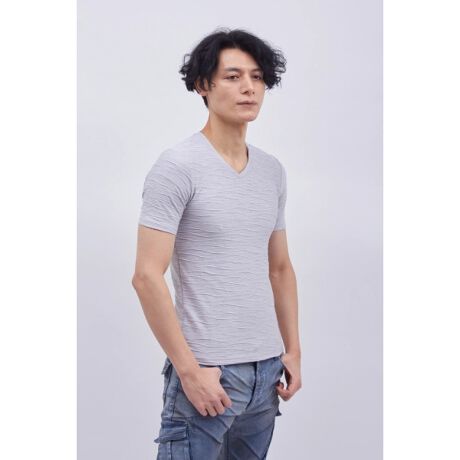 日本の技術が息づく、ボーダータックジャカードの涼やかでスタイリッシュなVネック半袖カットソー。