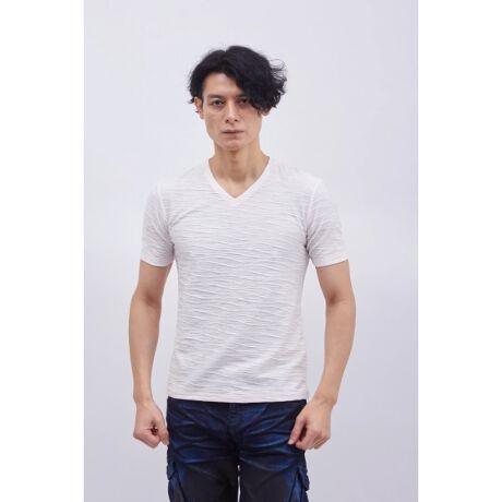 日本の技術が息づく、ボーダータックジャカードの涼やかでスタイリッシュなVネック半袖カットソー。