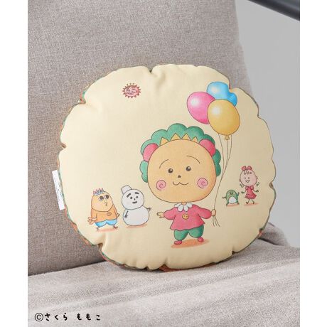 ころんっと丸いフォルムに、風船を持ったコジコジと仲間たちの愛らしいイラストが前面に配置されています。淡いクリームベースにカラフルな縁取りが効いており、ナチュラルなソファやグレーのチェアにもすっと馴染むデザイン。