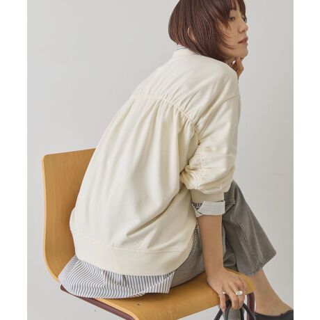 デイリーからお家でのリラックスシーンまで幅広く活躍するスウェットプルオーバー。フロントはシンプルながら、背中から腕にかけて施したギャザーラインが後ろ姿を女性らしくお洒落に演出します。スラックスやスカートなど合わせるボトムを選ばず、着回し力も抜群。一枚着はもちろん、シャツなどを覗かせたレイヤードスタイルもおすすめです。透け感[なし]