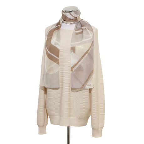 FURLAのアーチロゴをランダムにあしらったモダンなデザインのスカーフ。