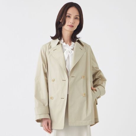 はっ水機能付きで雨の日もお手入れ簡単な、ショート丈のトレンチコートです。
