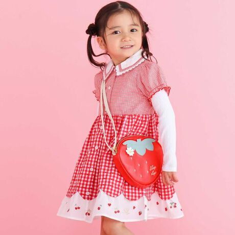 スカートはスカラップデザインで、裾の切り替えにはギャザーを施し、イチゴやチェリー、ハートの柄を散りばめたキュートな仕上がりです。