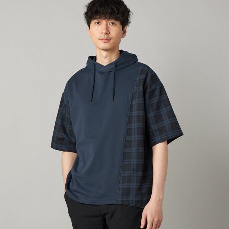 異素材の切り替えが目を引くデザイン半袖パーカです。
