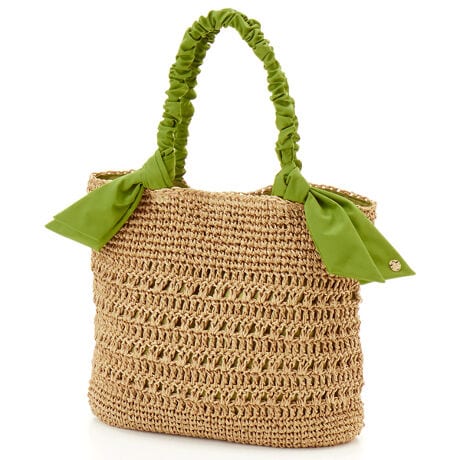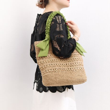 クシュクシュギャザーを寄せたハンドルと両側に下がるリボンがアクセントになったクロッシェトートバッグ。