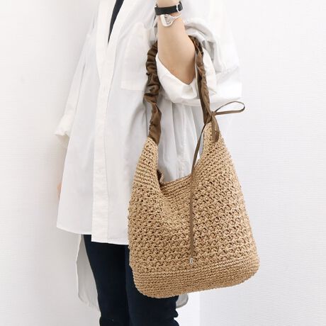 クシュっとギャザーを寄せたショルダーが可愛らしい、柄編みペーパー素材のショルダーバッグ。