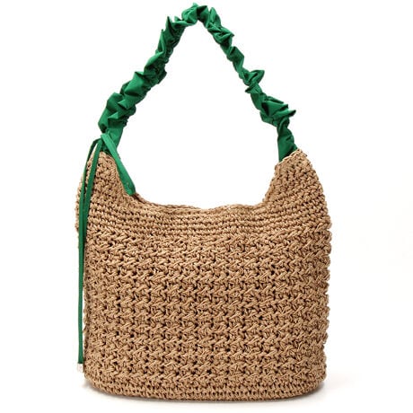 クシュっとギャザーを寄せたショルダーが可愛らしい、柄編みペーパー素材のショルダーバッグ。