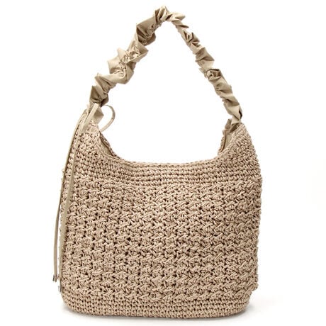 クシュっとギャザーを寄せたショルダーが可愛らしい、柄編みペーパー素材のショルダーバッグ。