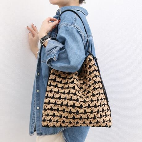 配色の柄編みが目を引くペーパー素材のクロッシェバッグ。