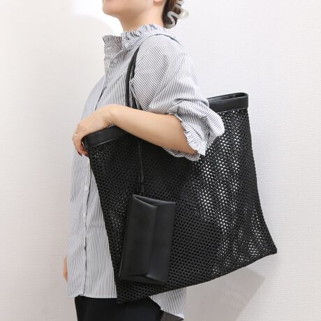 涼しげなメッシュ素材を使用したスクエア型手提げトートバッグ。