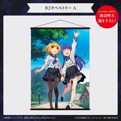 [型番:4573409345233]「ひぐらしのなく頃に 業/卒」よりキャラクターデザイン渡辺明夫描き下ろしの沙都子と梨花のタペストリーが登場!手を繋いで仲良く雛見沢を歩くふたりをぜひお部屋に飾ってください