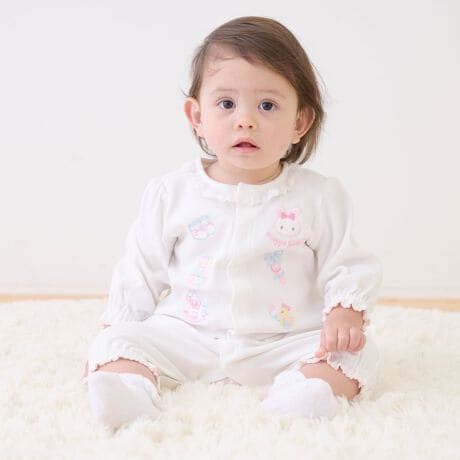 うさぎマスコットアップリケとやわらかなカラーリングのベビートイを刺繍した2WAYオールです。股部分のボタンの留め方次第でドレスタイプからカバーオール仕様に変更でき、成長に合わせた着こなしを楽しめるのも魅力。お揃いモチーフ刺繍をあしらったスタイ(品番:6261508)やソックス(品番:6261509)もご用意しているので色々なセットでギフトプレゼントするのもオススメです。