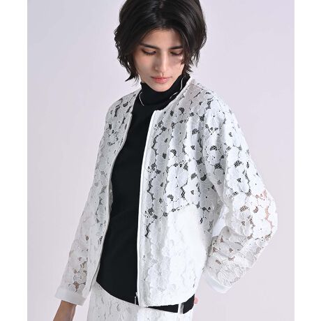 繊細なレースの印象に、フロントファスナーとニットリブ切替を掛け合わせることで、程よくカジュアルダウンしたデザインに仕上げている。