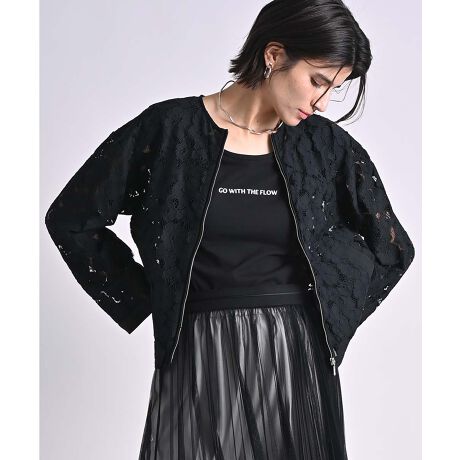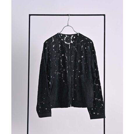 繊細なレースの印象に、フロントファスナーとニットリブ切替を掛け合わせることで、程よくカジュアルダウンしたデザインに仕上げている。