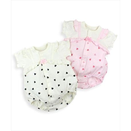 [型番:35343120]【綿100%】Si・Shu・Non(シシュノン)の「ハートフリルロンパース」は小さなハートの総柄にフリルがかわいいポイント!柔らかいやさしいジャガード天竺素材で、股下の中心はお着替えしやすいよう配色ボタンです。ギフトや出産祝いにもおすすめです。