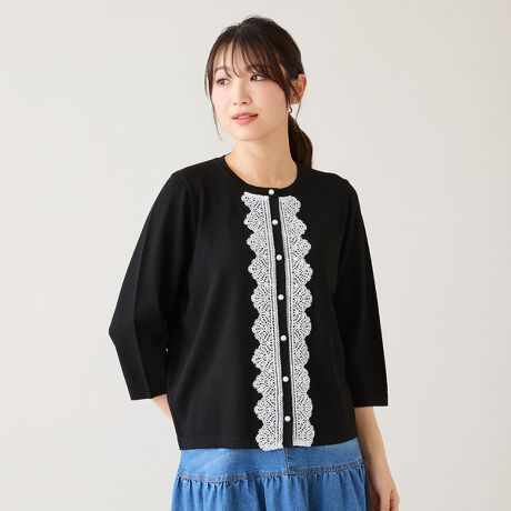 ・前立てにコントラストの効いたレースをあしらい、顔まわりを華やかに演出