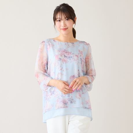 ・プリントにシフォンを重ねた軽やかな素材感が、動くたびにふんわりと優しい印象に
