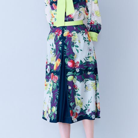 ・大胆なトロピカルフルーツのがモチーフのスカーフが並んだような四角い配置がポイントのスカート。