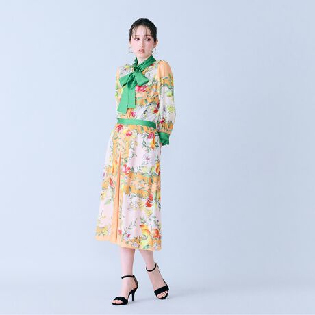 ・大胆なトロピカルフルーツのがモチーフのスカーフが並んだような四角い配置がポイントのスカート。