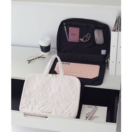 オリジナルのリボンキルティング素材を使用した、ハンドル付きのPCケース。