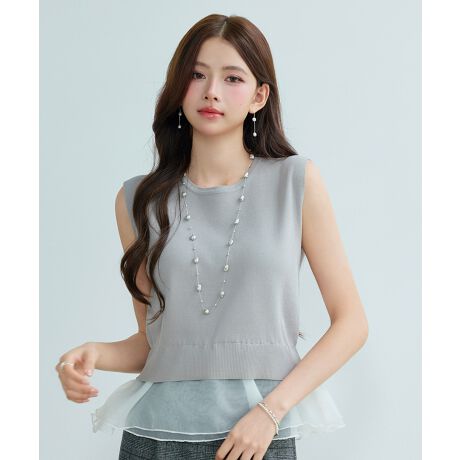 身頃部分がニット編み、裾周りにオーガンジーがドッキングされたデザインです。涼しげな印象を与えながらトレンド感をプラスします。