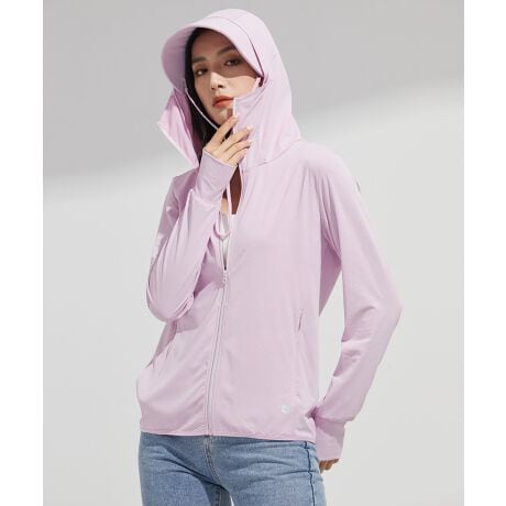 フェイスカバー一体型で顔まわりまでしっかり覆い、頬や口元の日焼け防止にも役立ちます。さらに大きめフード付きで頭から首元までカバーし、つばは取り外し可能なため、シーンに合わせて調整でき日焼け対策に最適です。