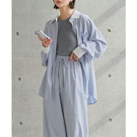 リラックス感ただようルーズシルエットのストライプ柄シャツとワイドパンツの2点セットは着るだけでオシャレな雰囲気を演出。