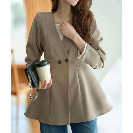 ダブルボタンとウエストをシェイプさせたトレンドのペプラムフォルムがアクセント。