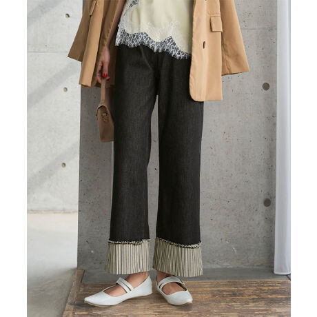 折り返した裾からのぞくストライプ柄が、さり気ないアクセントになるストレッチデニム。