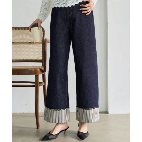 折り返した裾からのぞくストライプ柄が、さり気ないアクセントになるストレッチデニム。