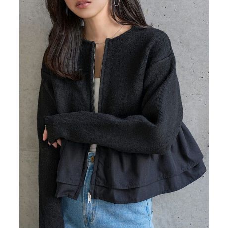 高め位置の切り替えデザインで着るだけでスタイルアップ見え叶えるノーカラーペプラムカーディガンです。