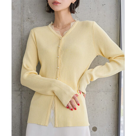 上品なレースがアクセントになった着るだけで抜け感の出る大人カーディガン。
